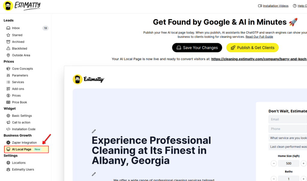 Navigate to the Business Growth -> AI Local Page option in the left-hand menu of your Estimatty dashboard.