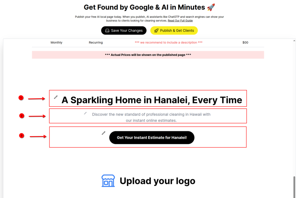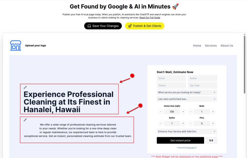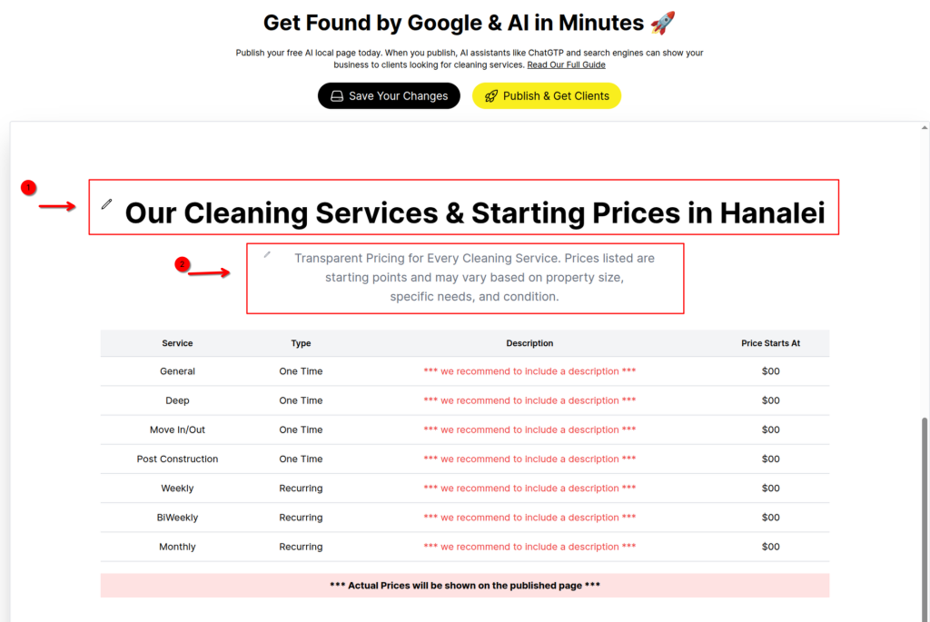 First, give your section a clear heading (1) and a brief introductory paragraph (2). Then, list your main cleaning services with simple titles and descriptions. This helps customers quickly find what they need, and the instant pricing is automatically generated by your Estimatty widget.The good news is Estimatty generates this table automatically when you publish the page!