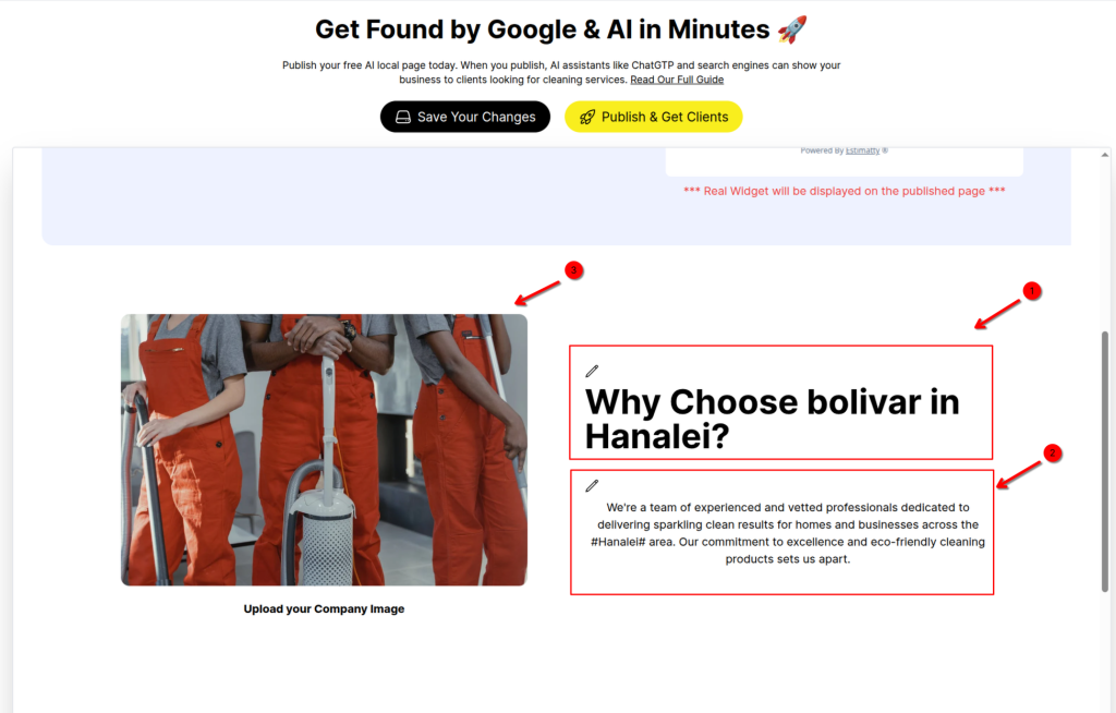 This is more than just a description—it’s your opportunity to shine. Start by giving your section a unique title that reflects your brand (1). Then, write a compelling description that tells your story (2), shares your values, and explains what sets your company apart. To make a lasting impression, upload a high-quality image of your team or the owner (3). A professional photo adds a personal touch that builds confidence and shows the people behind your great service.
