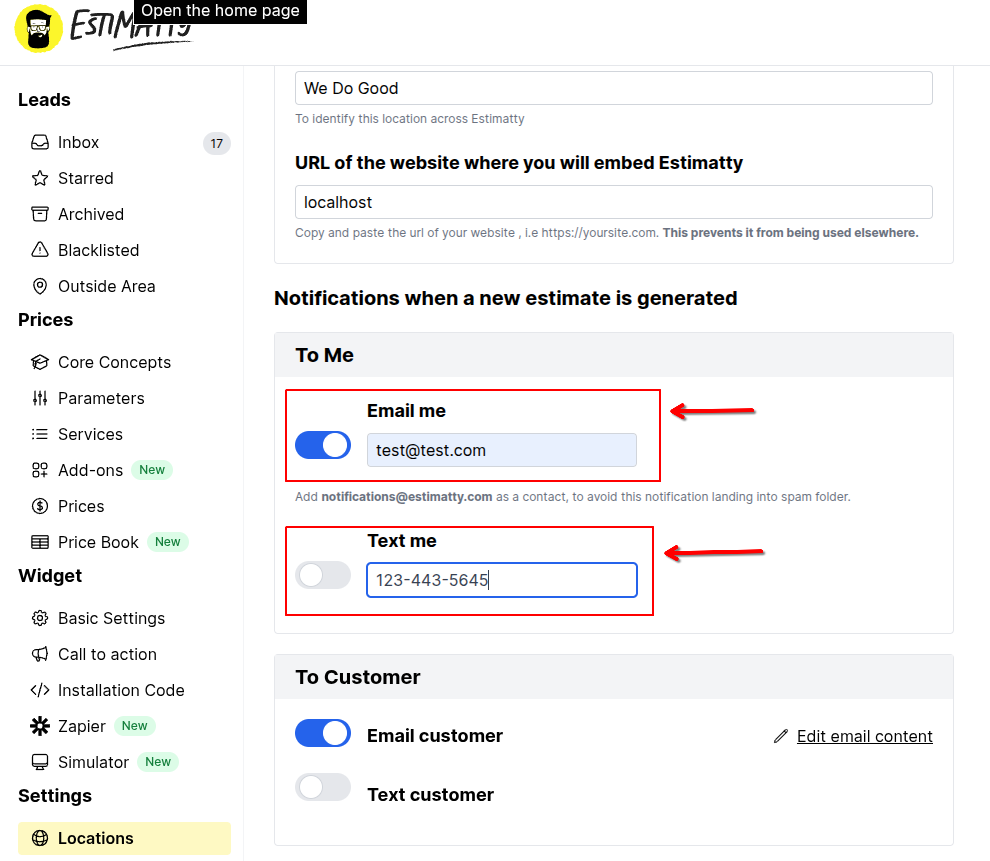 Scroll to the Notifications When a New Estimate is Generated section. Here, you can toggle the Email me or Text me options on or off, depending on your preference. Once the options are enabled, you can modify the email or cell phone number.